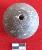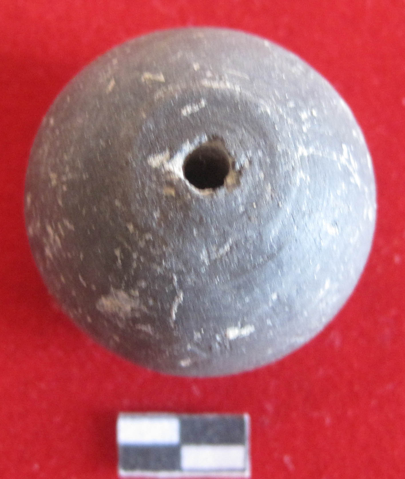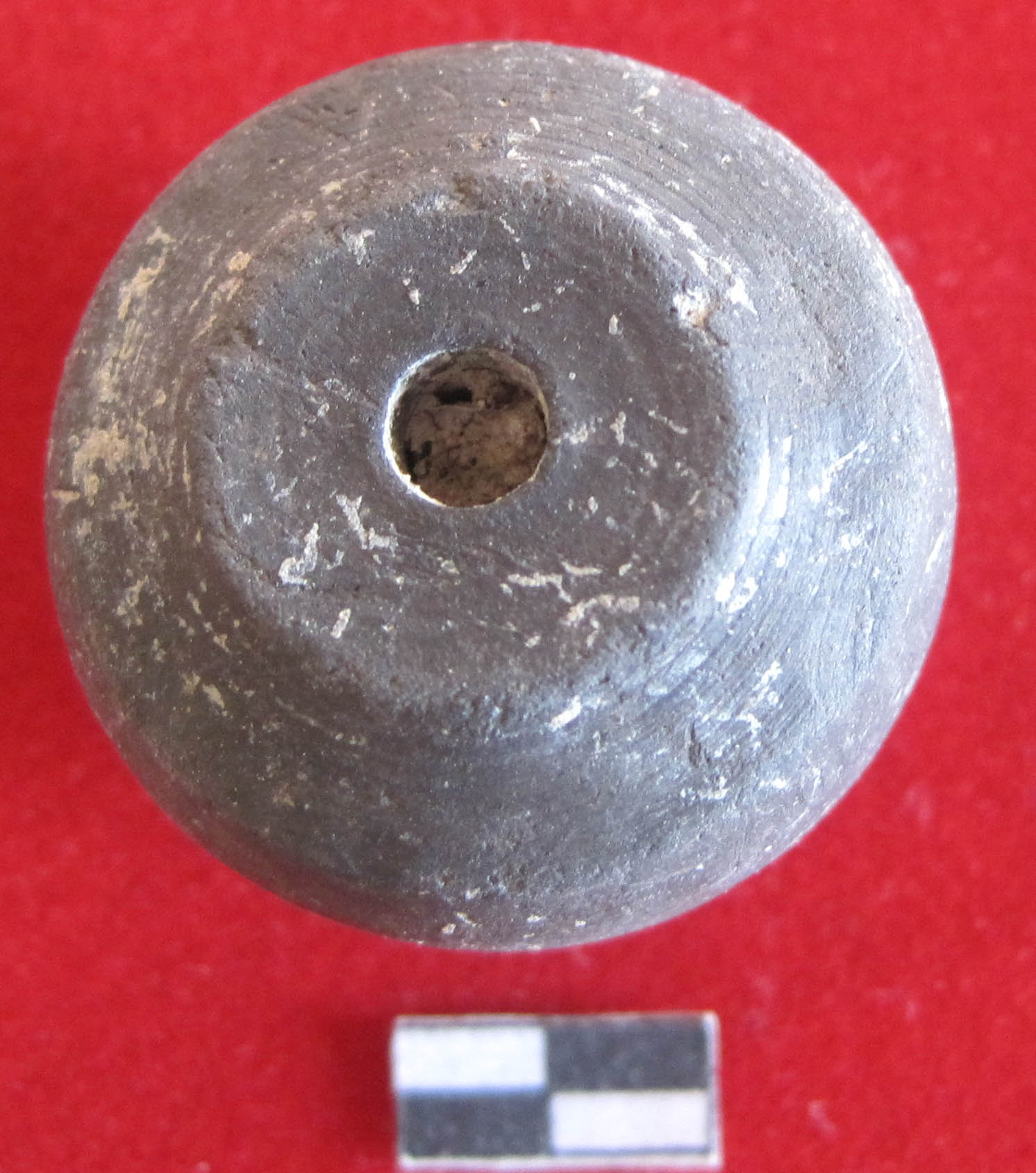 Arcanut shaped with pointed top. Perforation in center part of object. Use as ornament purpose. Blackish in color. Smooth surface.