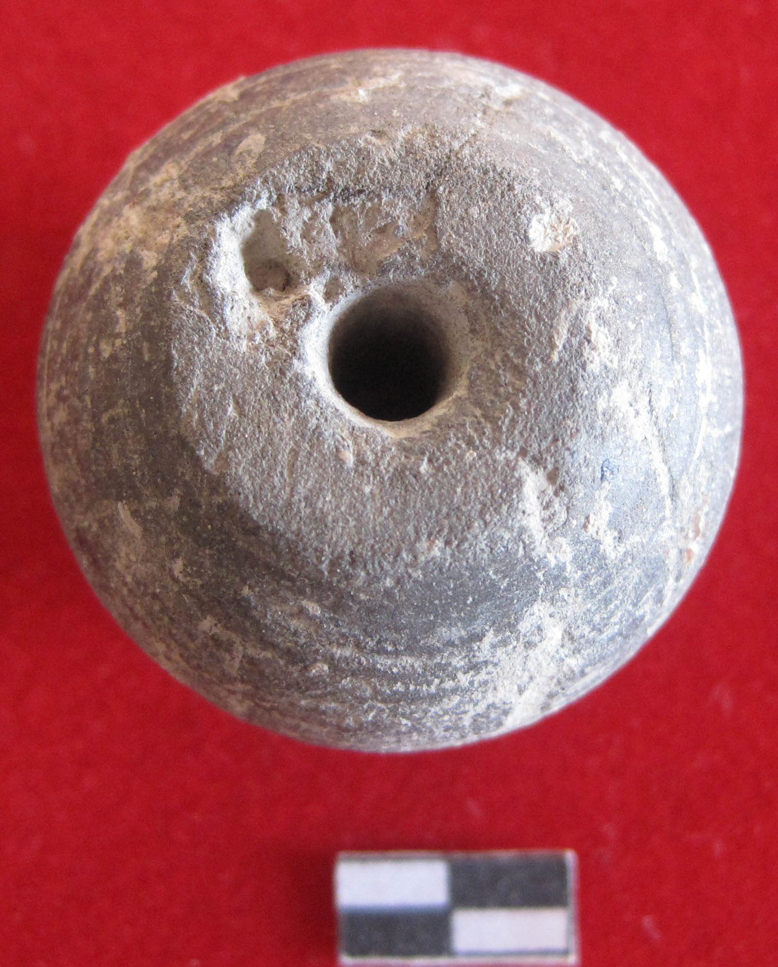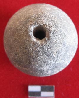 Arecanut shaped bead truncated top. Perforation in center part of object. Use as ornament purpose. Red in color. Smooth surface.