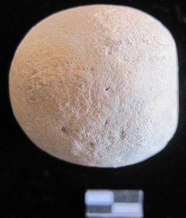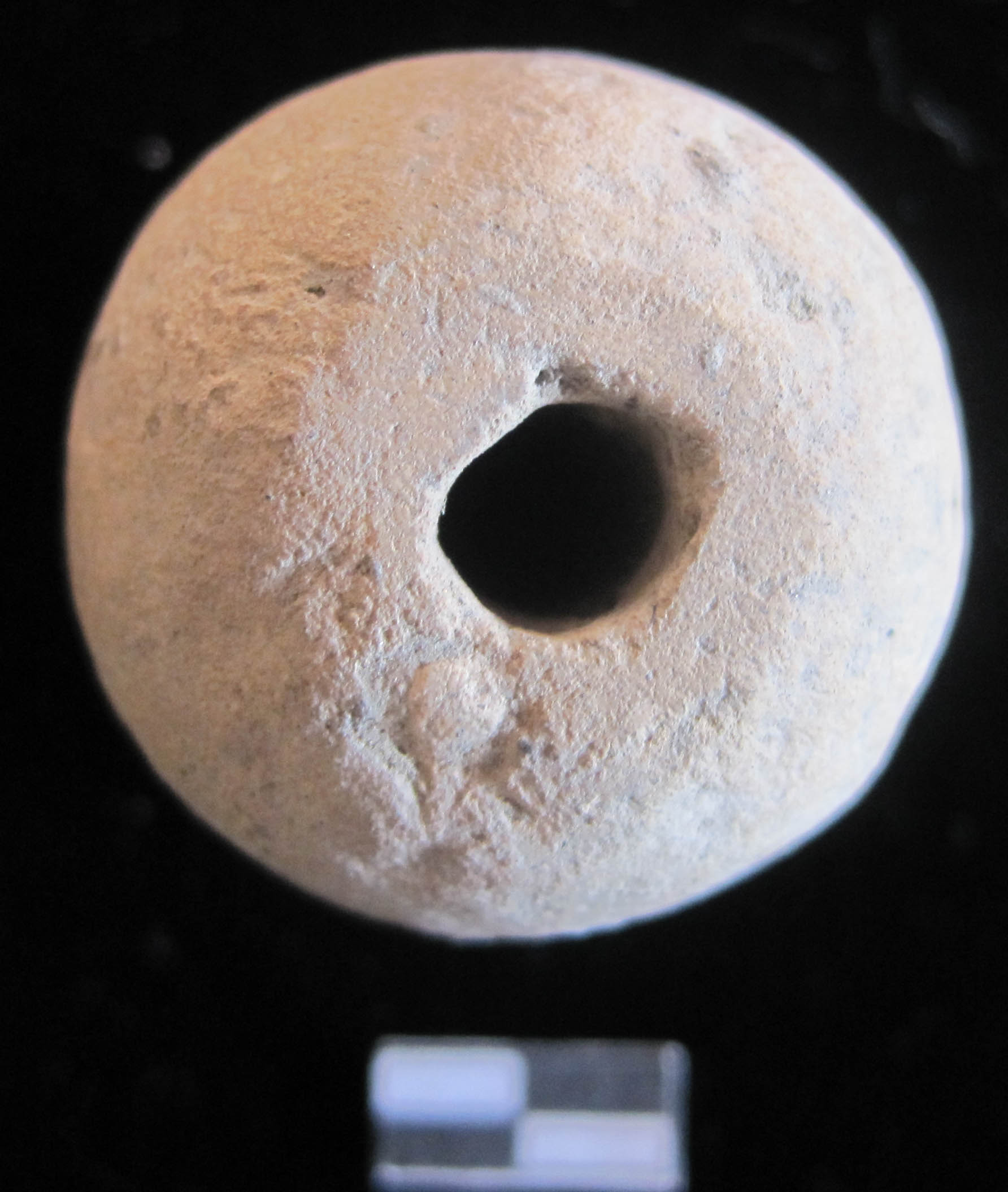 Long circular in shape. Perforation in center part of object. Use as ornament purpose. Red in color. Smooth surface.