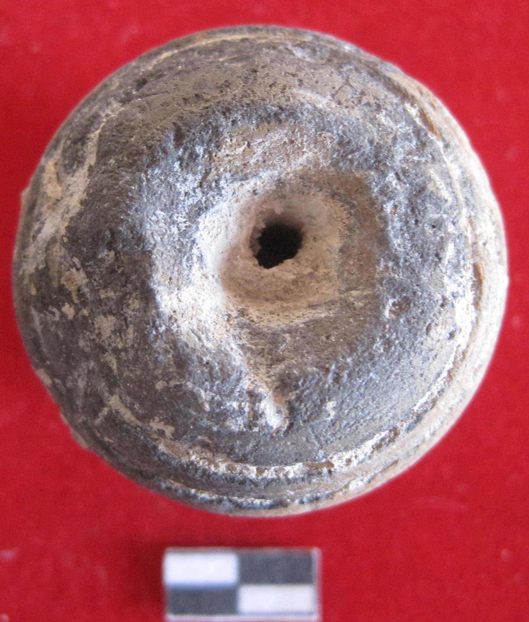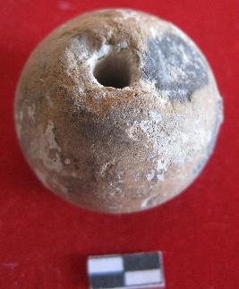 Arecanut shape with rough surface. Perforation in center part of object. Use as ornament purpose. Blackish in color. Smooth surface.