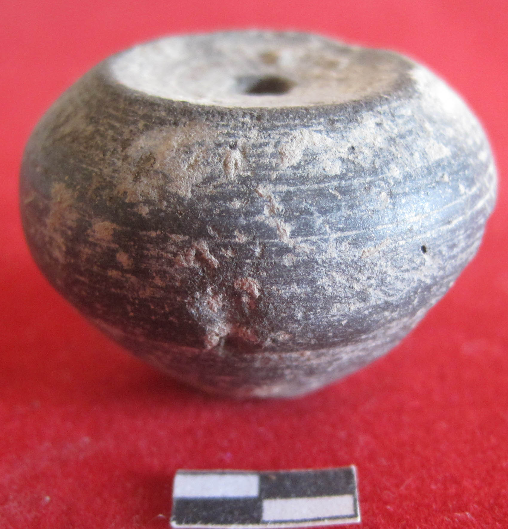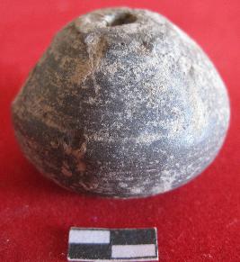 Arecanut shaped bead with smooth surface. Perforation in center part of object. Use as ornament purpose. Blackish in color. Smooth surface.