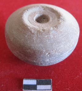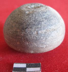 Arecanut shaped bead. Perforation in center part of object. Use as ornament purpose. Red in color. Smooth surface.
