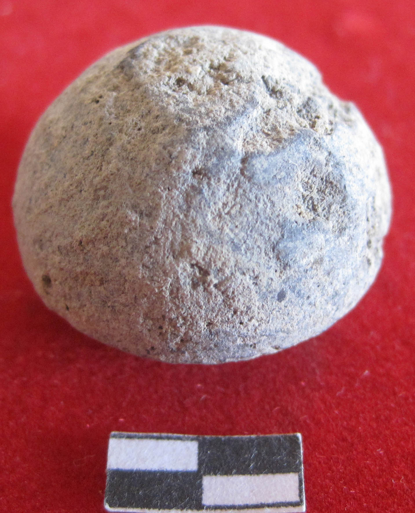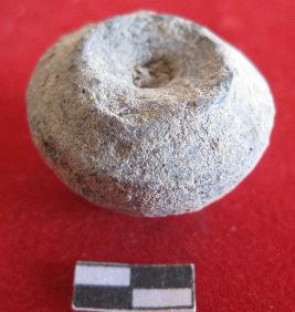 Arecanut shape bead with a rough surface. Perforation in center part of object. Use as ornament purpose. Blackish in color.
