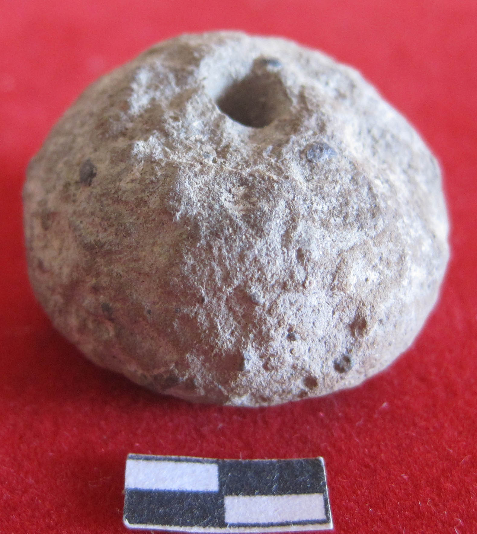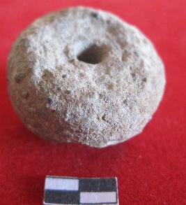 Arecanut shape bead with rough surface. Perforation in center part of object. Use as ornament purpose. Blackish in color.