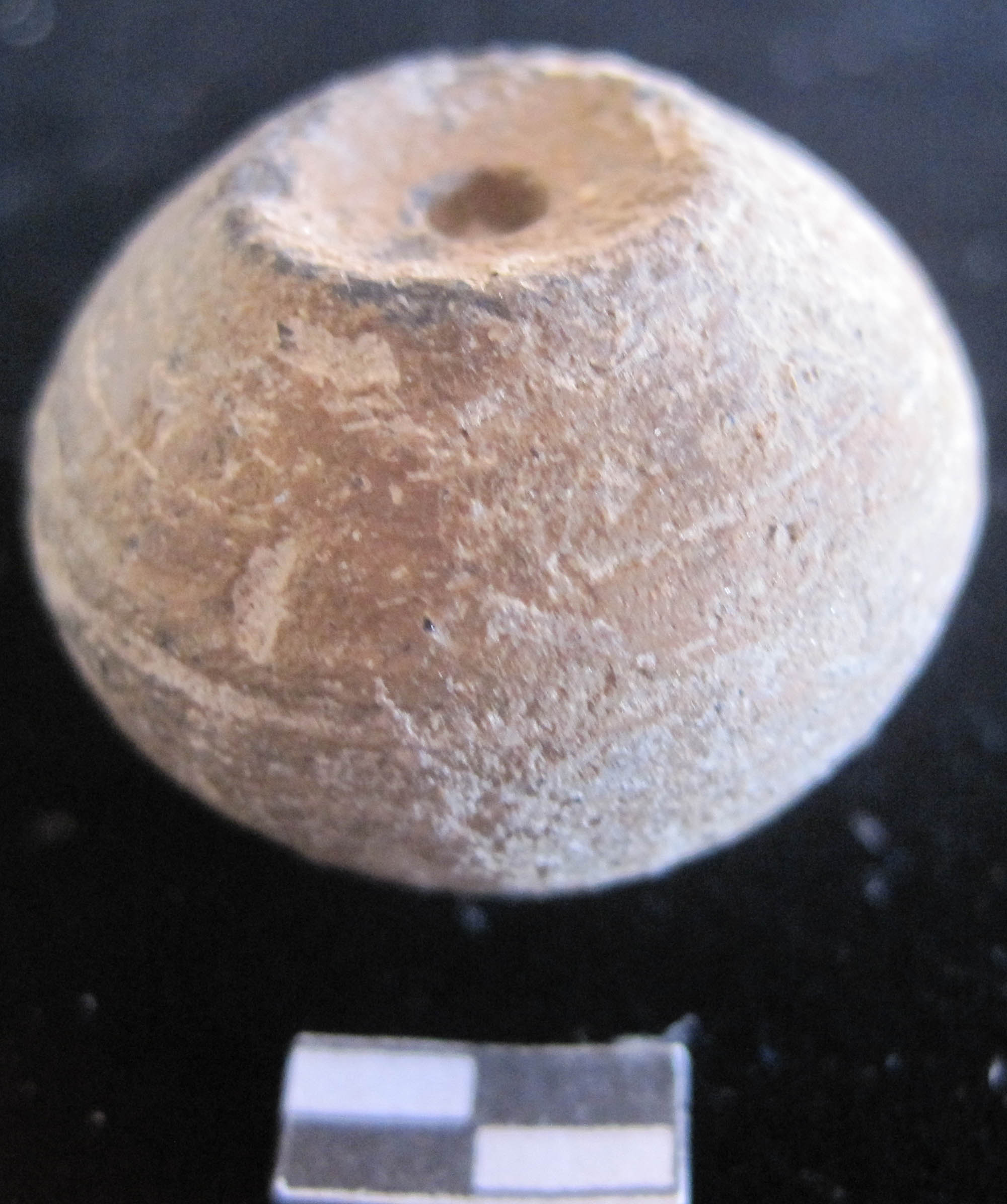 Ghat shaped bead. Perforation in center part of object. Use as ornament purpose. Blackish in color. Smooth surface.