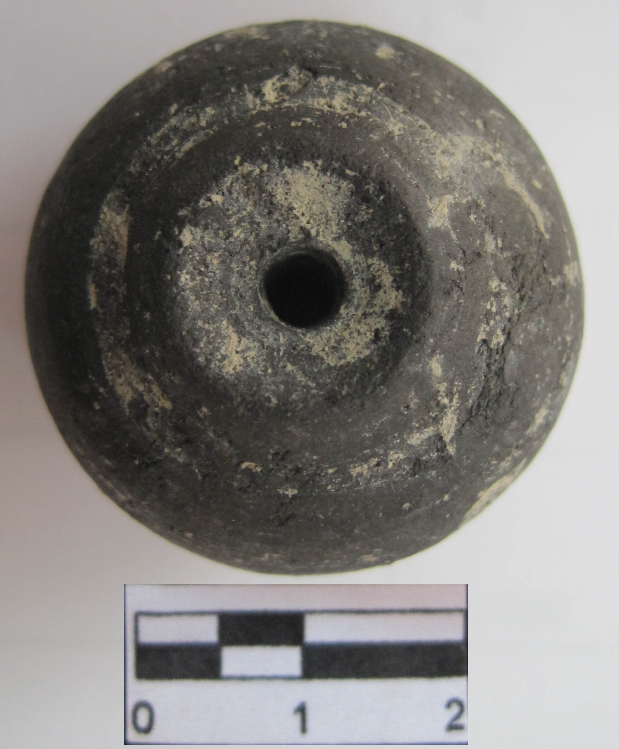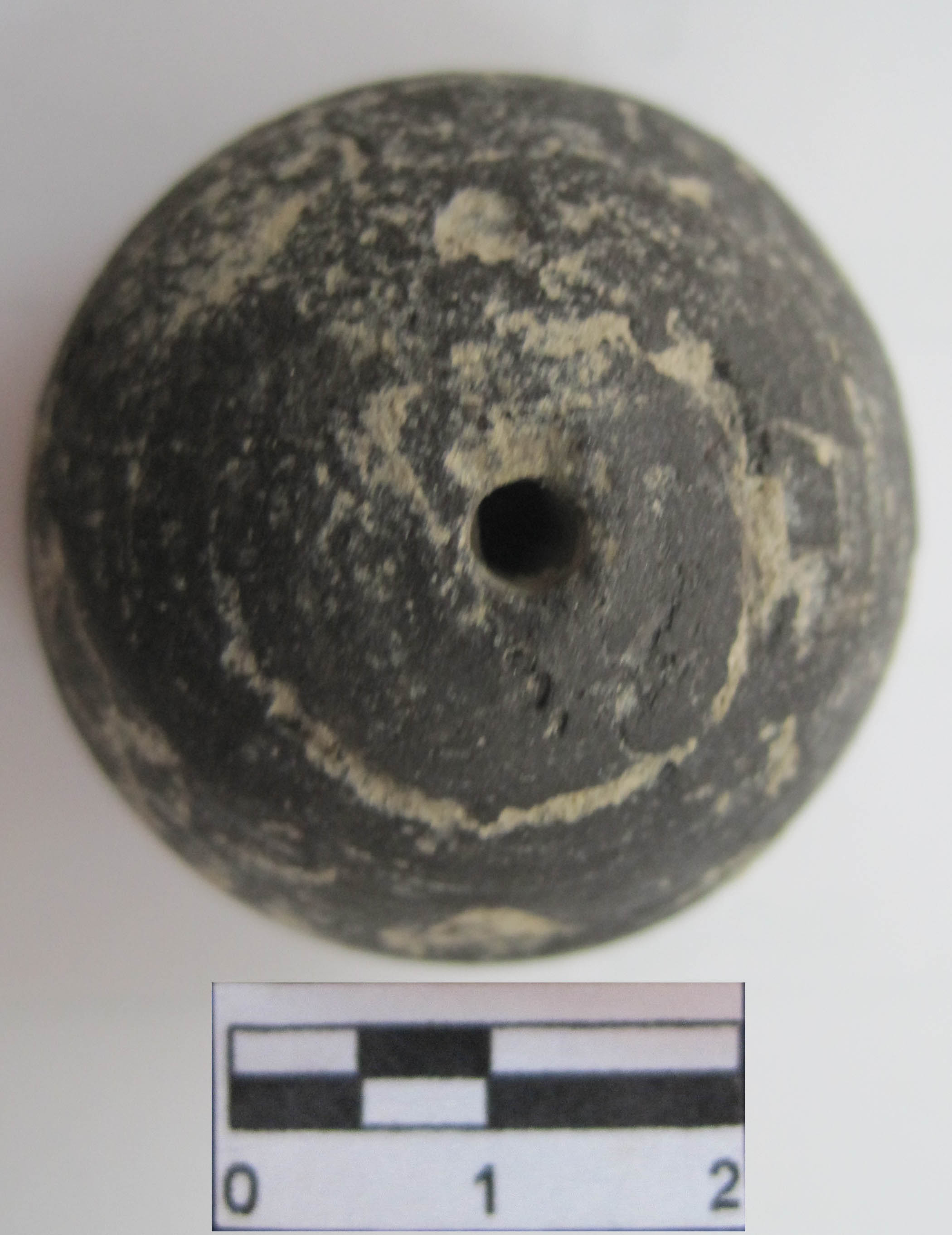 An arecanut shaped bead, having incised line design on the top. Perforation in center part of object. Use as ornament purpose. Blackish in color. Smooth surface.