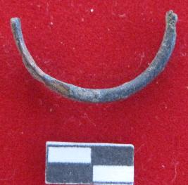 Broken copper ring with flat top. Corroded surface.