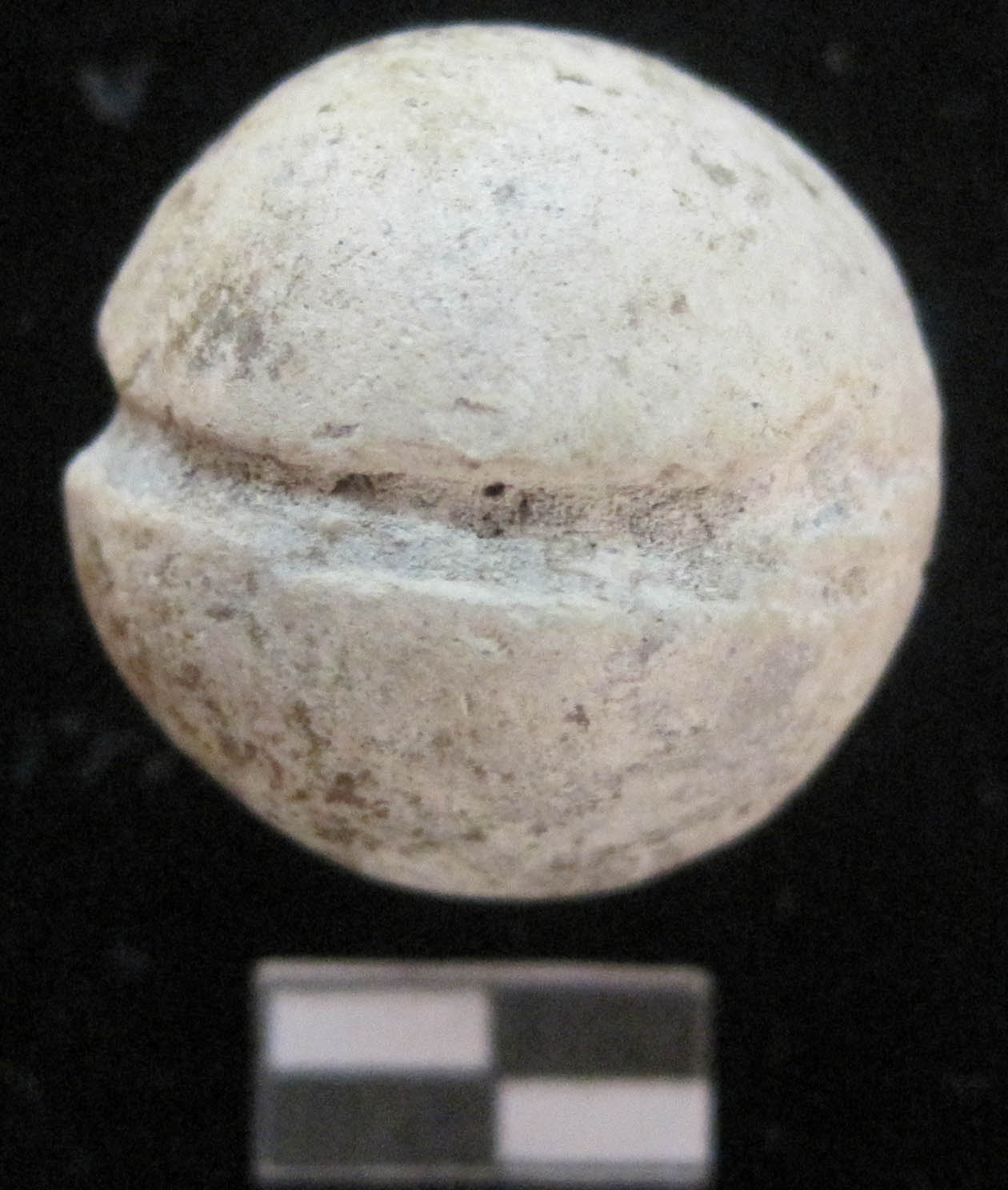 Made out of well baked. Rounded. smooth surface. a thick line on middle part of object