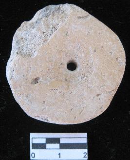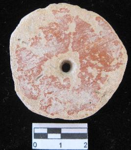 Made out of red pot sherds.Outer edge is partially broken