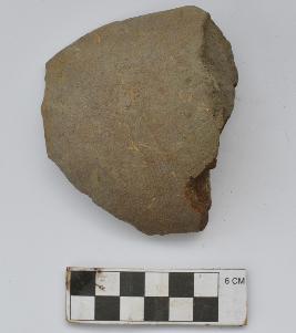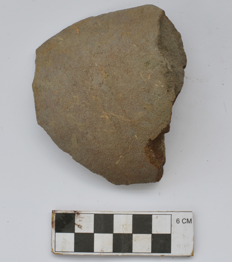 A piece of grinder stone. It is broken, one side has curved surface and one side is plain broken part . The curved side has a smooth surface.