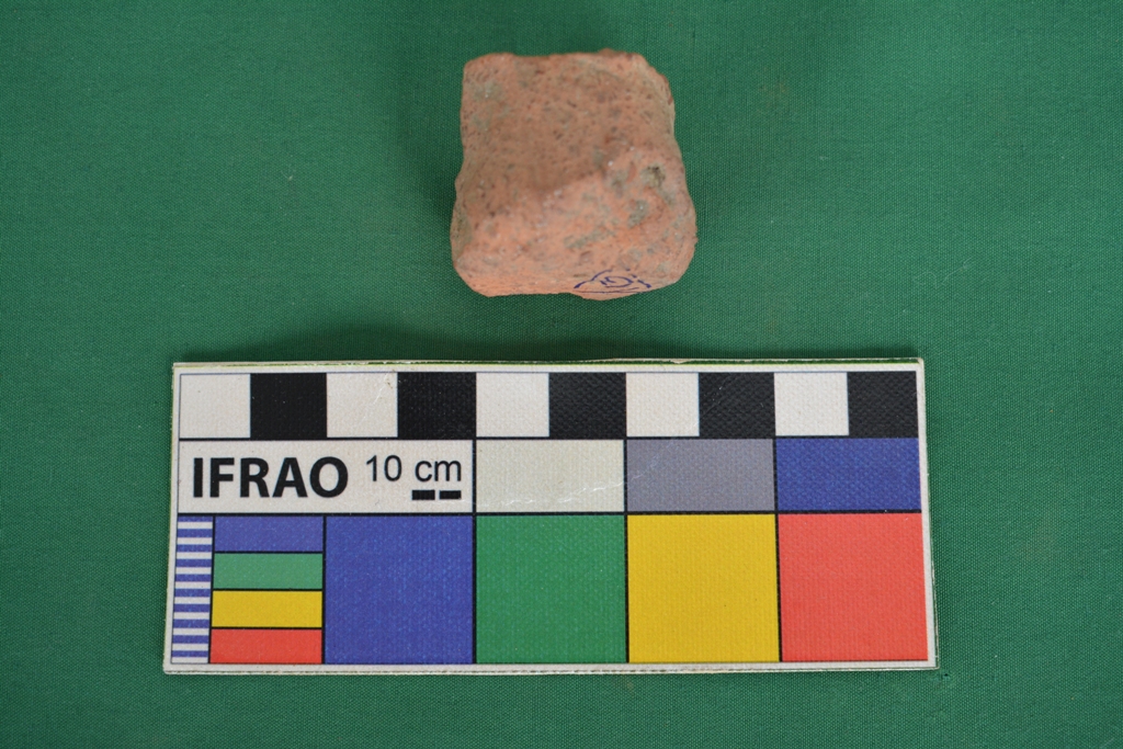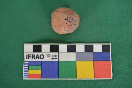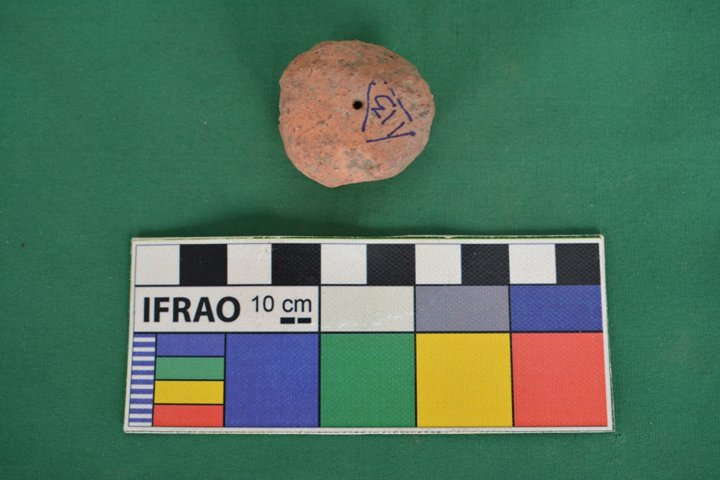 It is cylindrical shape with small horizontal perforation at the centre. One end is flat and the other end is broken. Red in colour. Clay is not well levigated.