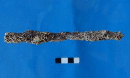Head is missing and the shank is tapered, one end is thick and the other end is thin. It is of rectangular section and heavily encrusted