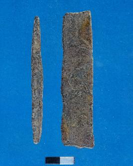 | Description / विवरण | 1-Fragment of a knife, it is rectangular shape and its upper part is thicker than the lower part i.e the cutting edge. 2-Roughly square section nail, both ends are tapered and pointed. Middle part is thick |