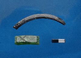 | Description / विवरण | 2 Glass bangle pieces. Circular section.two different in color. One object is green in color . Green color bangle piece cross design on surface. |