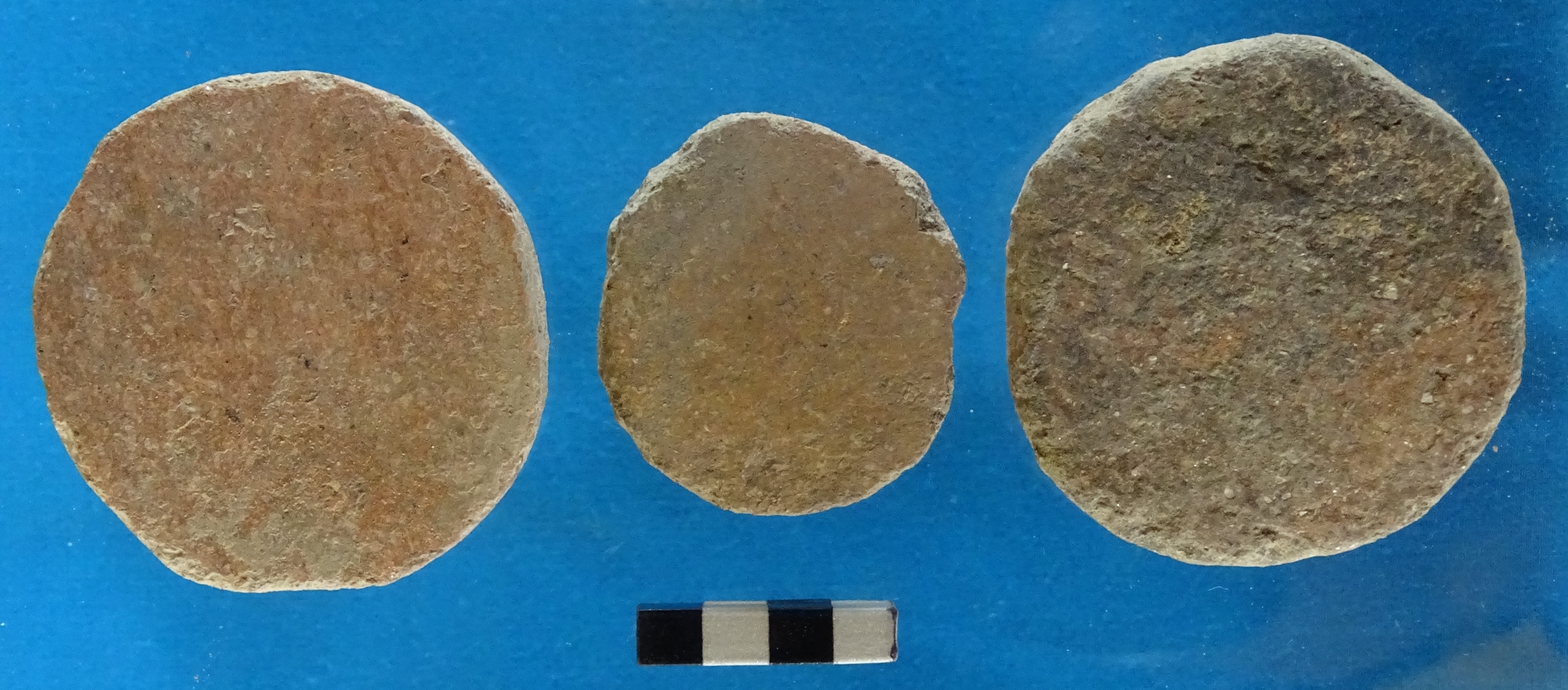 3 hopscotches It is made out of Red micaceous potsherd. It is roughly circular shape. It has evidence of rubbing on its periphery to get the desired shape. The thickness is not uniform.