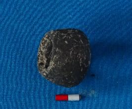 | Description / विवरण | Elongated barrel shaped terracotta bead, a perforation at the centre.broken from edges. Coarse surface. |
