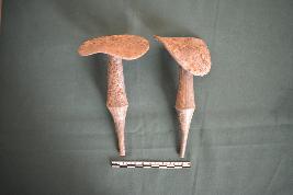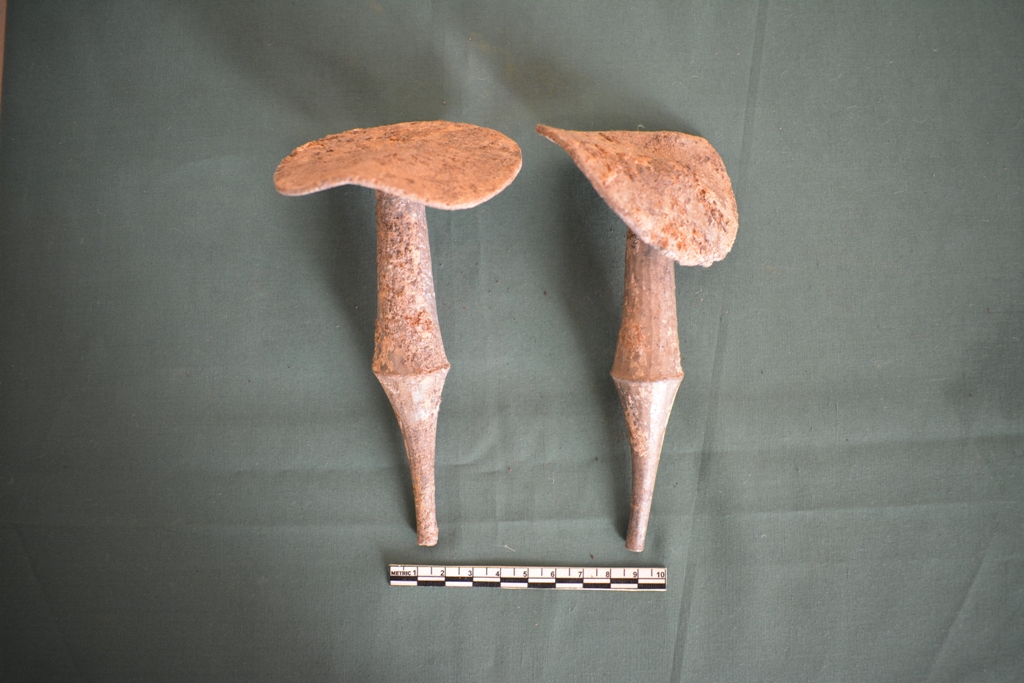 Two pieces of umbrella shape earring . Both in the same shape and size. It has a long shaft and flat round canopy. The shaft is tall, upright and bicone shape, tapering at the tip. .