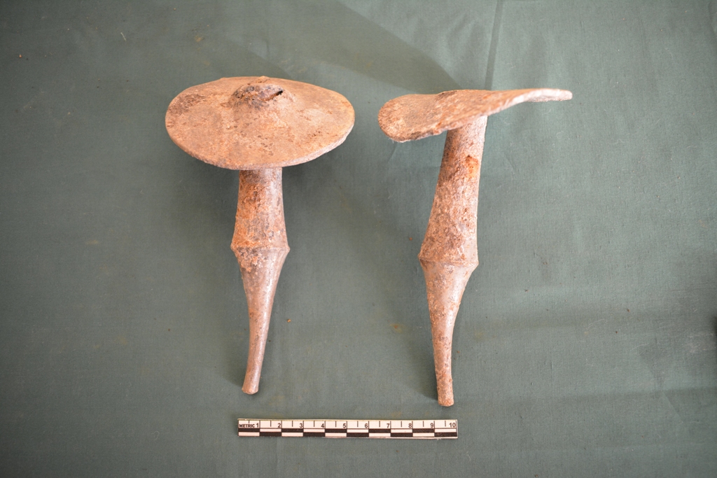 Two pieces of umbrella shape earring . Both in the same shape and size. It has a long shaft and flat round canopy. The shaft is tall, upright and bicone shape, tapering at the tip. .