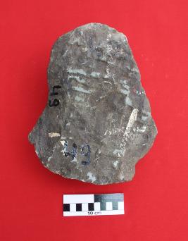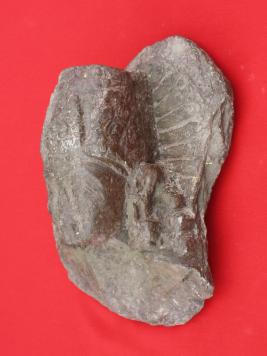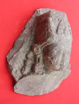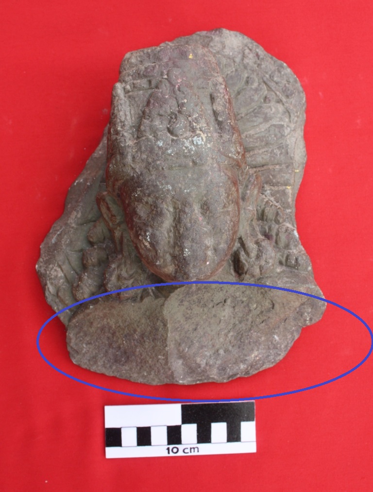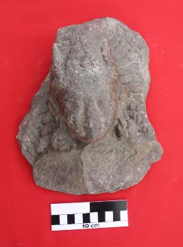A head of male deity adorned with crown and earrings, image is fully chopped off. below the neck. A lotus petals medallion broken is decorated behind his head. Lock of curly hairs is visible both side of head.