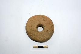 | Description / विवरण | A terracotta handmade wheel of a toy cart, it has a hole in the middle. The surface of the object is partly rough and red in colour. |