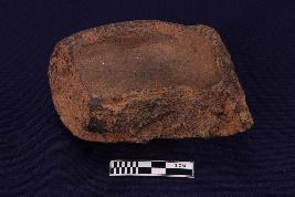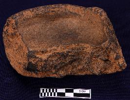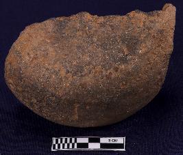 A thick circular terracotta lamp with a flat base. It is decorated with nail tip design at the outer periphery.