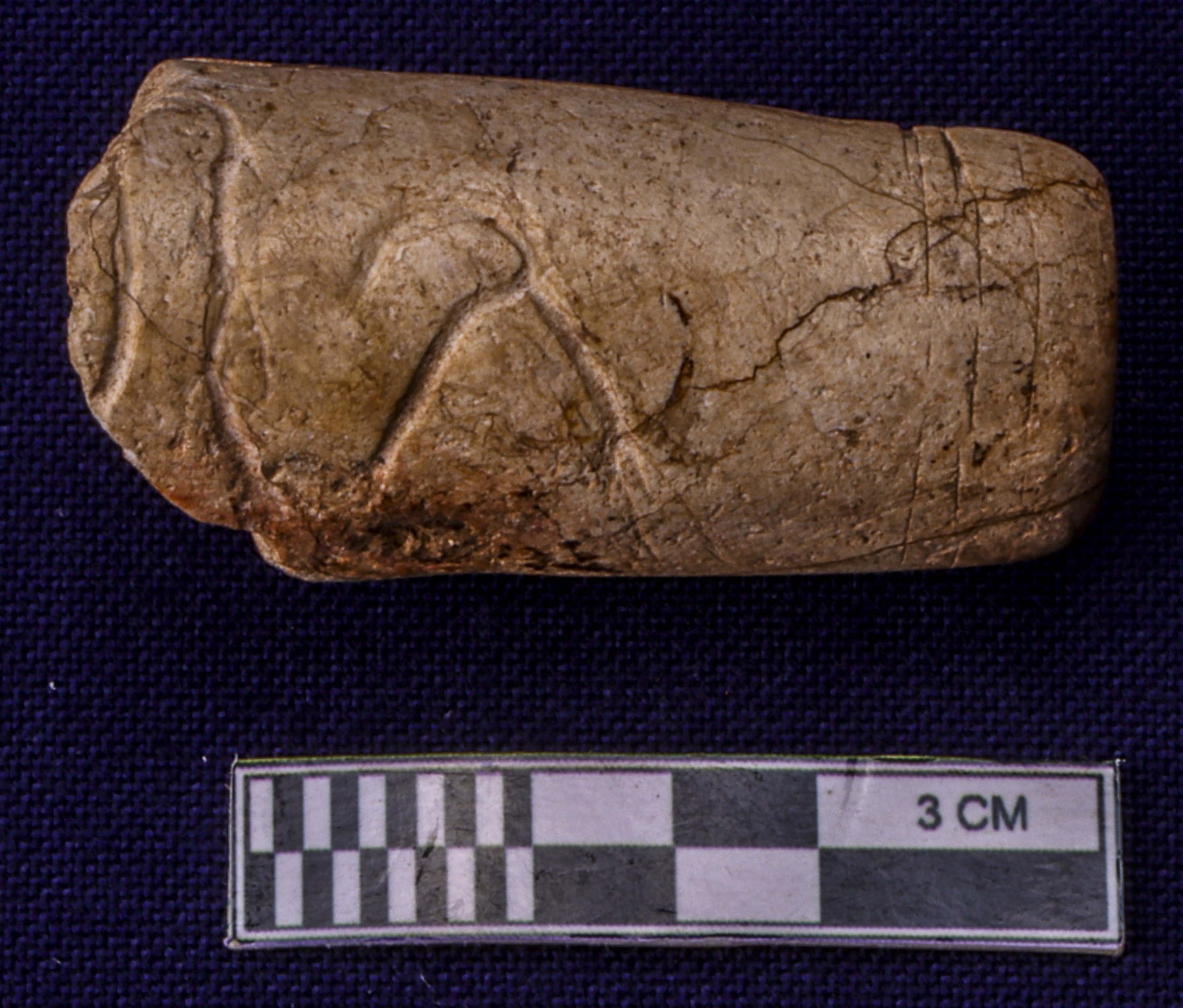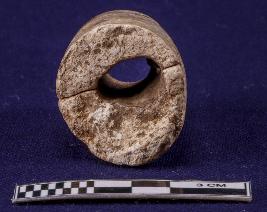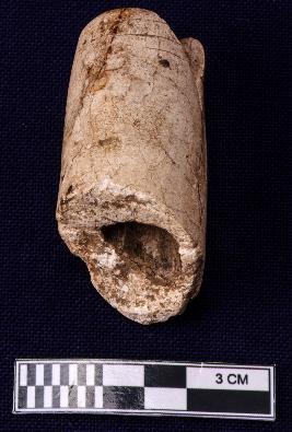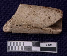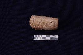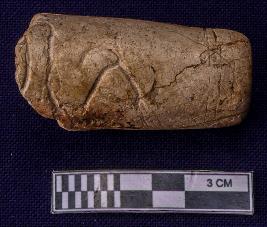 Fragmentary nozzle piece of a spout with circular incised lines at the tip. An inscription is also noticed at the nozzle but only one letter survives. It seems like Brahmi letter Sa of Sunga -Kushana period.