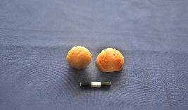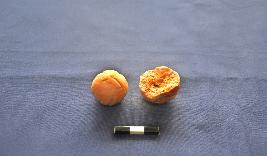 | Description / विवरण | Two pieces of ribbed sling ball, both of them have groove design on the surface. one is intact and red in colour with smooth surface. Another one is half-broken and red in colour. The surface of this sling ball looks like a pumpkin. |