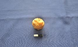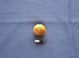 | Description / विवरण | A broken sling ball, it is red in colour and the surface of the object is smooth. It has ribbed designs on the surface and looks like a pumping. |