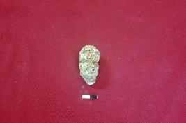 | Description / विवरण | Mutilated stucco head with decorated headgear, eyes are partially visible and right eye is highly damaged. There are two holes on the face. |