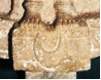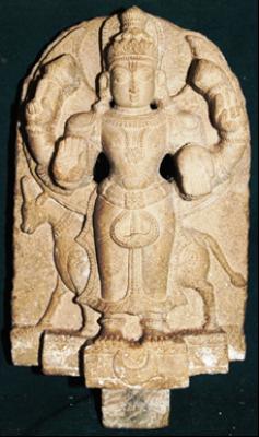 Four armed standing Chandra. Holding lotus in both upper hands, lower right in abhaya and left hand in varada pose. Half moon is curved on the pedestal.