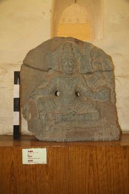 | Description / विवरण | Siva is shown seated on a pedestal in sukasana with four hands. He holds a trisula in his upper left hand and a kapala in his lower left hand. The upper right hand and the attribute in the lower right hand are broken. He is shown with three eyes and fangs. He is adorned with ornaments and a lower garment. The sculpture is broken into two pieces and mended together. |