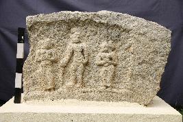 | Description / विवरण | Hero stone depicting a hero holding sword in right hand and left hand placed on kati. He is flanked by females on either side. The females are adorned with a side bun hairstyle and a lower garment. The male is adorned with a headdress and a lower garment. As a result of weathering, the sculptures details have been obscured. |