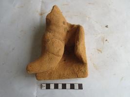 A broken terracotta plaque, depicting a human figurine. Only the thigh up to the knee and belly portion is intact. The right thigh is shown bending kneel down. Part of the left leg is shown in front of the thigh. Hands and upper body above the belly is broken.
