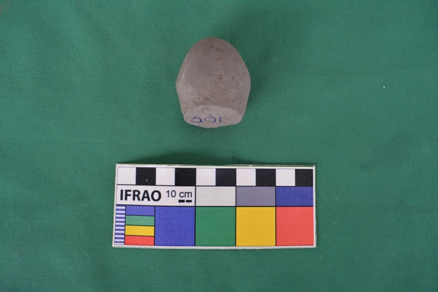 Head holder of a pestle. The lower part is broken. It is in the shape of a bell-shaped mushroom cap. The lower part of the pestle is broken
