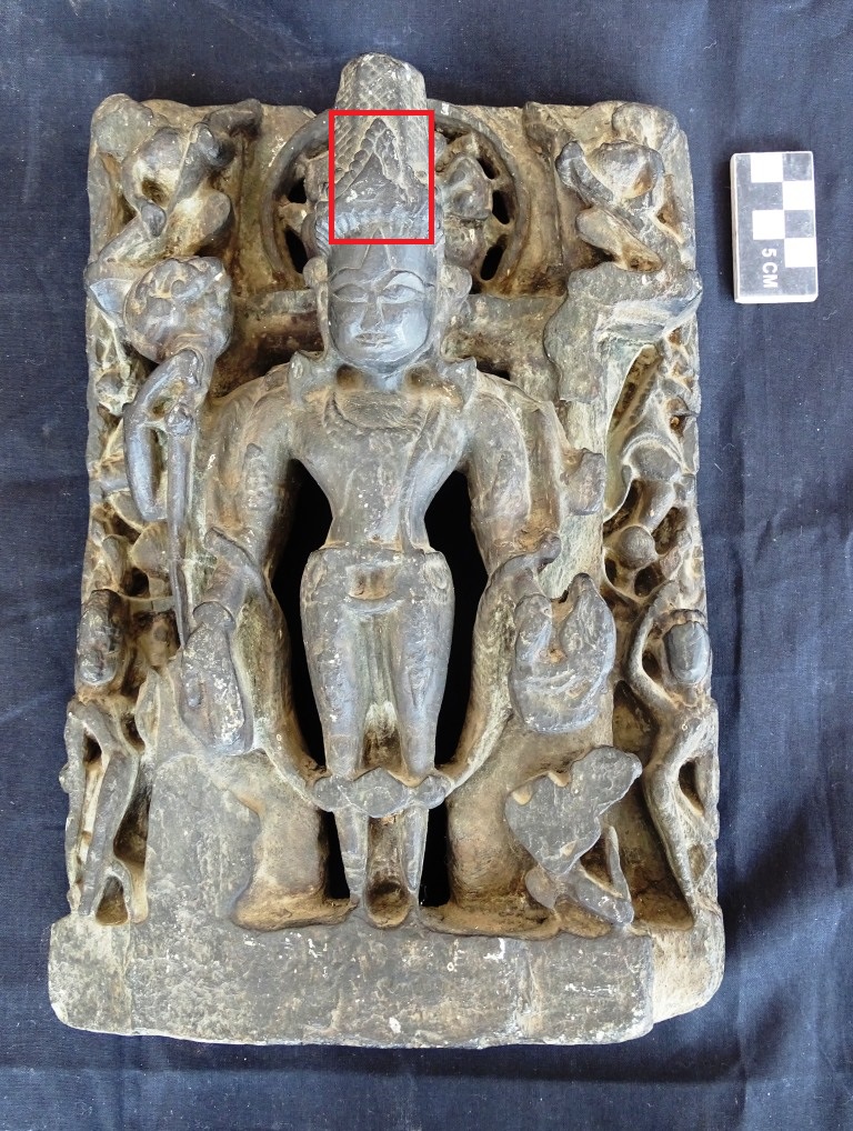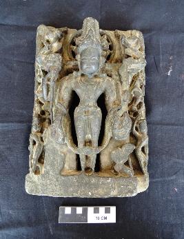 Vishnu is standing in sampada position. He is wearing long crown, earring, necklace, bangles, girdle, yajnopavita , a string of cotton thread, and garland. In his right hand, he is holding mace and left upper arm is broken. In lower left hand he holds conch shell, and the other lower hand is in varad mudra. On the upper part of the statue ornate aura is depicted as well as vinadhara.