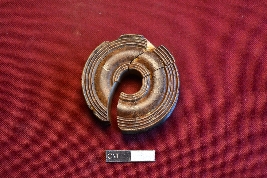 | Description / विवरण | A Ear-stud made on bone, it is circular in shape with a perforation. One side is designed with circular lines while other side is also decorated with circular design but there are some gap between lines. It has circular cross section. |