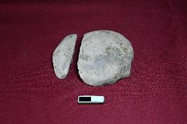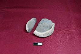 A broken terracotta lamp, it has straight featureless rim and circular in shape, wick is visible.
