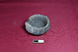 | Description / विवरण | Terracotta lamp. Circular in shape, slightly inturned rim, wick is intact and slip treatment given in black colour. |
