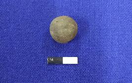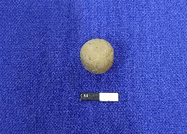 | Description / विवरण | A sling ball made of terracotta round in shape. The colour of the object is black and the surface is rough. A depression can be seen. |