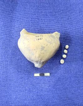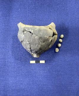 | Description / विवरण | Fragment of terracotta rattle including four tiny terracotta balls, it has has broken handle and globular body with perforation and hollow interior. |