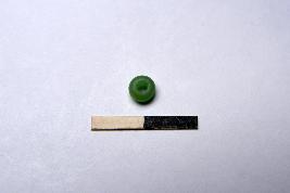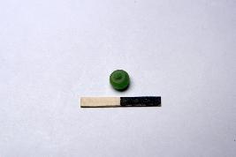 A Glass bead of circular shape, green in colour, smooth and polished surface. The bead is centrally perforated and has circular cross section.