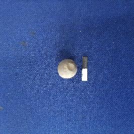 A terracotta ball in round shape with smooth surface. It has some irregular marks on it. The colour of the object is grey.