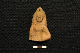 | Description / विवरण | A terracotta plaque, representing a female figurine in standing posture with her right hand resting on the waist with curly hair on head. There is a hole above her head. It is depicted in low relief. |