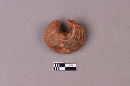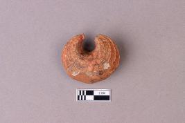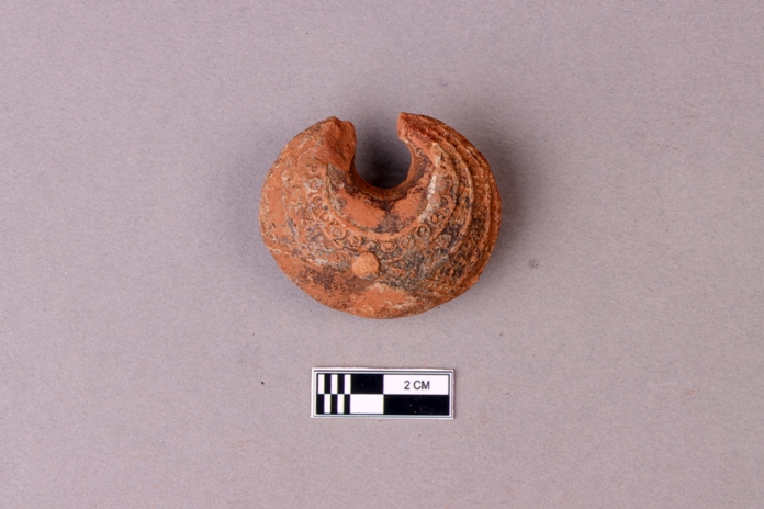 Ear ornament decorated with series of circular pattern with dots and oblique incised lines and dotted beaded decoration, on both faces of the ornament.
