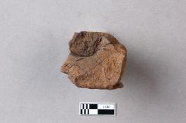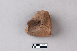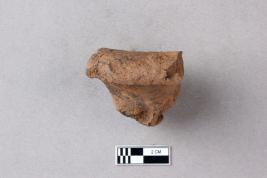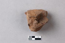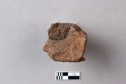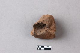 Mahavihara sealing, upper part broken. A part of an incuse is visible with a partial single-line inscription. The script is probably Siddhamatrika. It is yet to be deciphered.