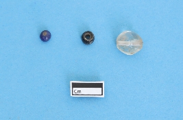 | Description / विवरण | 1. Standard. Circular oblate, dark blue glass, has crizzling marks, has parallel perforations at the axis. Translucent in nature. Thin body. Glittery glass. 2 . Standard. Circular barrel shaped bead, black glass, has parallel perforations at the axis. Opaque in nature. Thin body. Glittery glass 3. Standard. Plano-convex shaped bead, transparent glass, has crizzling marks, has parallel perforations at the axis. Transparent in nature. Thin body. Glittery glass. Minute carvings on the outer side can be seen on the bead. |