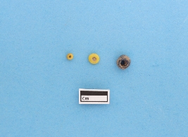 | Description / विवरण | 1. Circular shaped micro bead, skin in color, has parallel perforations at the axis, covered with dust. Opaque in nature. Thin and delicate body structure. Glittery glass. 2. Circular oblate shaped disk type flat short bead, has length less than 1 3rd of its diameter, yellow in color, has parallel perforations at the axis. Opaque in nature. Thin and delicate body structure. Glittery glass. 3. Standard circular barrel shaped bead, has length more than 9 10 and less than 1 1 10 of its diameter, black glass, has parallel perforations at the axis, has wider apex and axis. Opaque in nature. Thick body. Glittery glass. White clay dirt is stick to it from the outside. |
