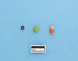 | Description / विवरण | 1.Circular oblate shaped micro bead, black glass, has parallel perforations at the axis. Axis covered with dust. Opaque in nature. Thin, delicate but polished body. Glittery glass 2. Short barrel shaped bead, light green glass, has wider apex, has parallel perforations at the axis. Opaque in nature. Thin but polished body. Glittery glass. 3. Cylindrical elongated shaped bead has fragmented edges, orange glass, crizzling marks, has parallel perforations at the axis. Must be broken from some other bead or ornament. Opaque in nature. Thick and polished body. Glittery glass. |