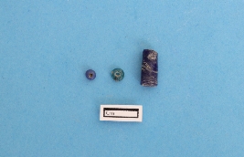 | Description / विवरण | 1. Circular oblate shaped standard bead, has diameter more than its length, navy blue glass, has parallel perforations at the axis. Translucent in nature. Thin, delicate yet polished body structure. Glittery glass. 2. Circular oblate short bead, green glass, has parallel perforations at the axis. Translucent in nature. Thin, delicate yet polished body structure. Glittery glass. 3. Long cylindrical shaped bead, has spiraling marks, navy blue glass, length more than its diameter, has parallel perforations at the axis. Translucent in nature. Thick and polished body structure. Glittery glass. |
