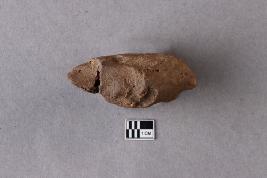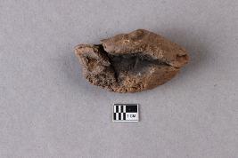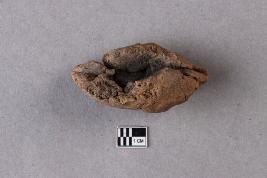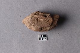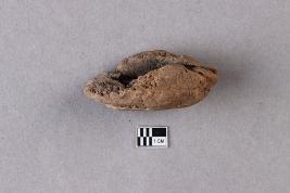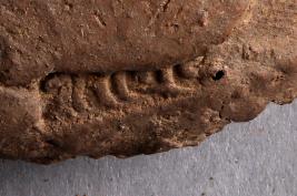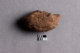 | Description / विवरण | A broken clay lump has a trace of an inscription on one surface, while another surface has a cavity with smoky patches. The legend is not clear or complete. |